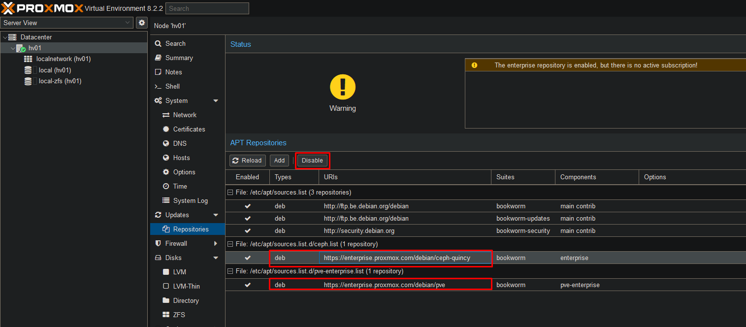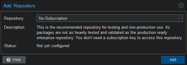 Now select Add, click ok on the subcription warning and add the “No-Subscription” repository