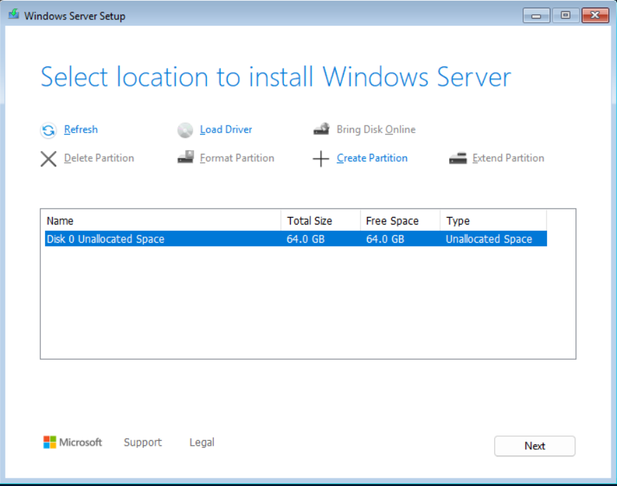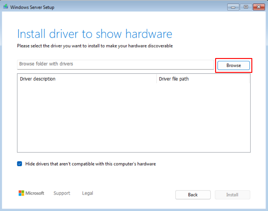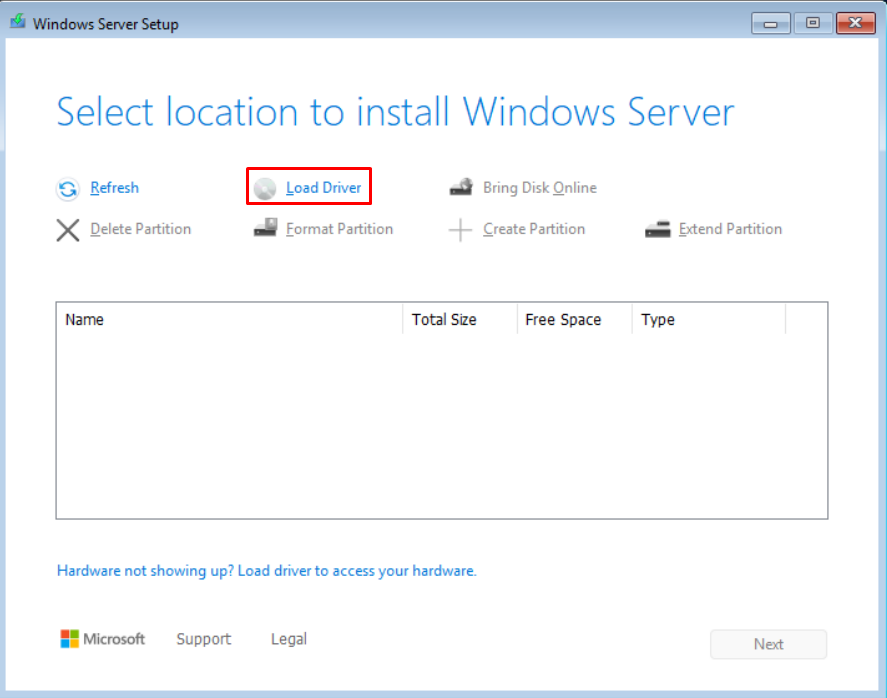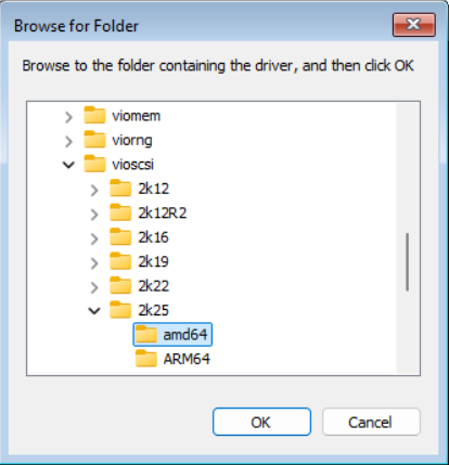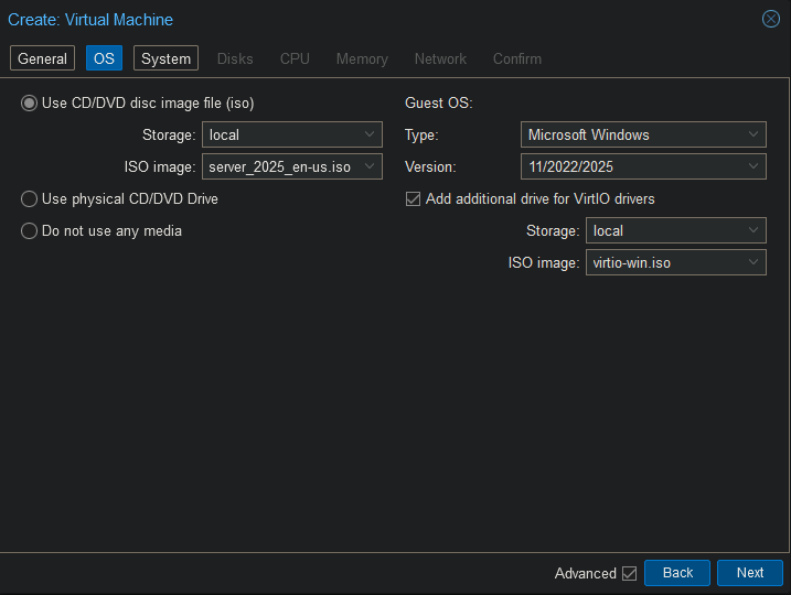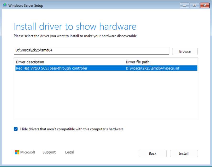 You will notice the system does not find any hard drives. You will have to load the virtio iscsi drivers from the ISO mounted during VM creation.
