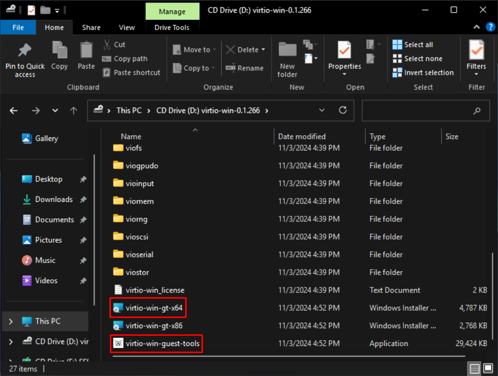 Once windows is installed open the virtio ISO and install the following 2 files.