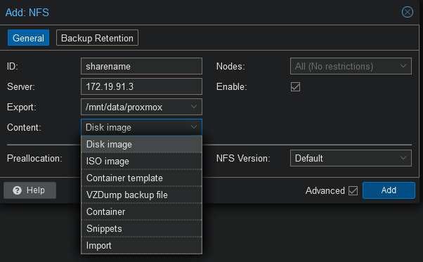 Set the name for Proxmox as the ID and enter the IP address of the server hosting the NFS share.