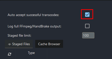 Scroll down a little and enable “Auto accept successful transcodes”.