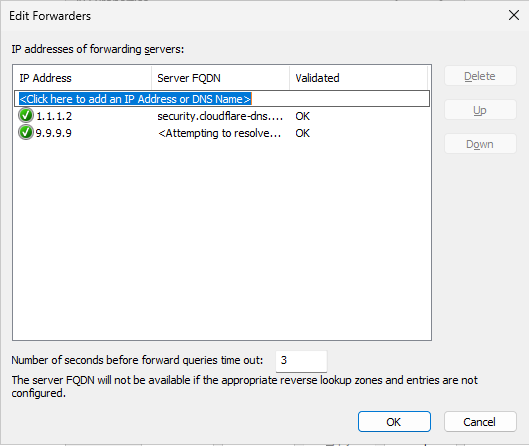 Enter some public DNS servers as forwarders and click on “OK”.